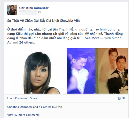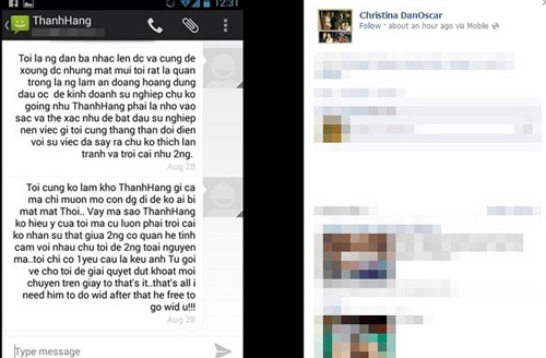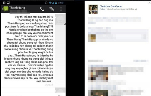 Christina DanOscar tố cáo Thanh Hằng và chồng mình liên tục cặp kè bên nhau trong mọi sự kiện từ Nam ra Bắc. Cô này còn tố những chiếc xe Thanh Hằng sử dụng đều của đại gia T.